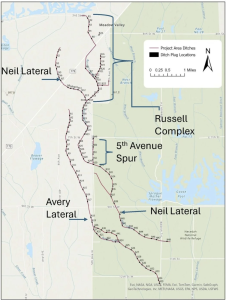 The map on the left illustrates proposed ditch plug locations on select laterals throughout NNWR.